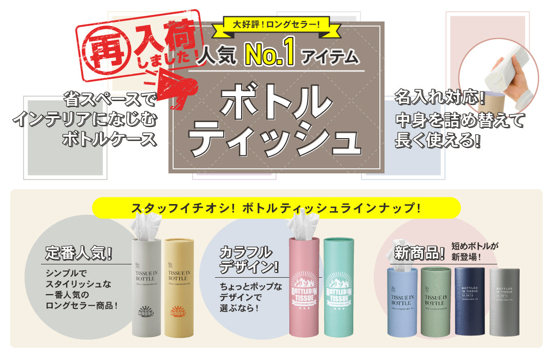 人気ナンバーワンのノベルティーアイテムであるボトルティッシュ。