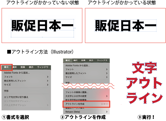 - アウトラインをかけずに拡大縮小を行うとデザインや幅が大きく変動する場合がございます。