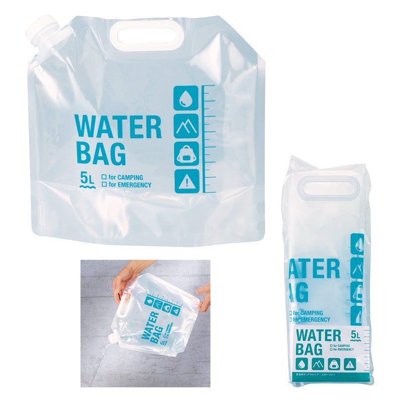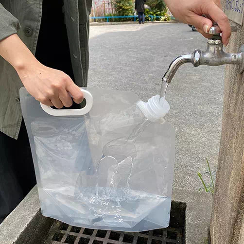 こうした被災時の水の運搬・保管に役立つのが「ウォーターバッグ」です。普段はつぶして折りたたむことができ、給水所までの持ち運びも楽々。