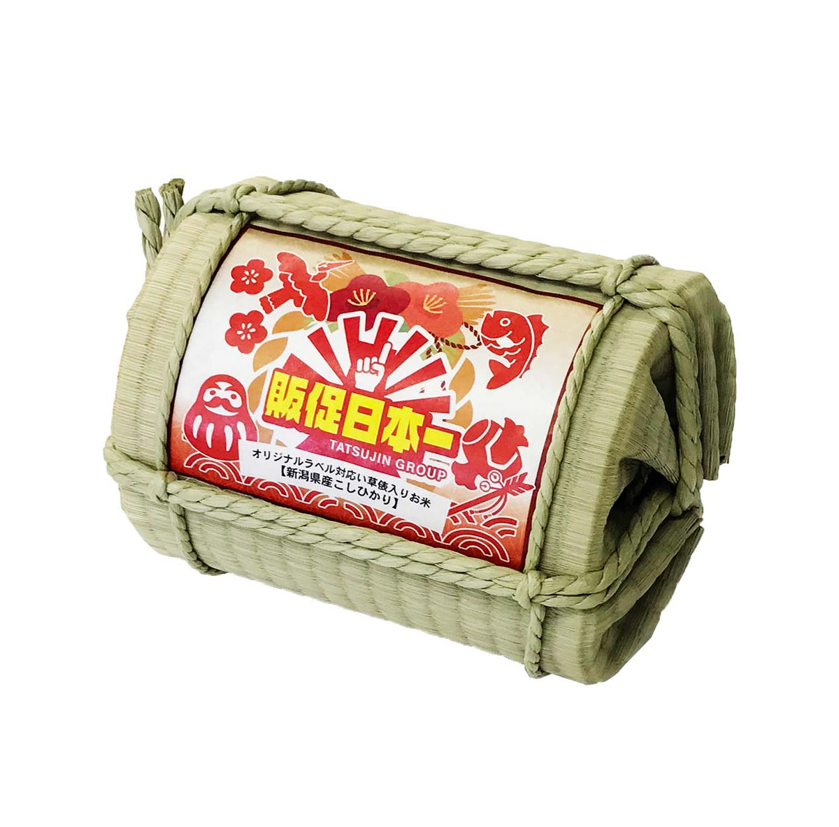 ラベルをフルカラーオリジナル印刷ができる米俵ギフトです。畳みなどにも使われる「い草」の香りが懐かしい、米俵入りの華やかなお米ギフトです。1人で抱えられるサイズ感と1個~作成できるフルカラーのオリジナルパッケージが魅力。お米は新潟産のコシヒカリを使用しています。積み上げておけば人目を惹きつけるディスプレイにもなります