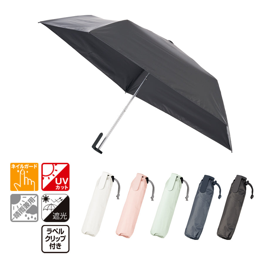 約160gと軽量かつスリムボディで、クリップ形状ハンドルが特徴の遮光折りたたみ傘です。