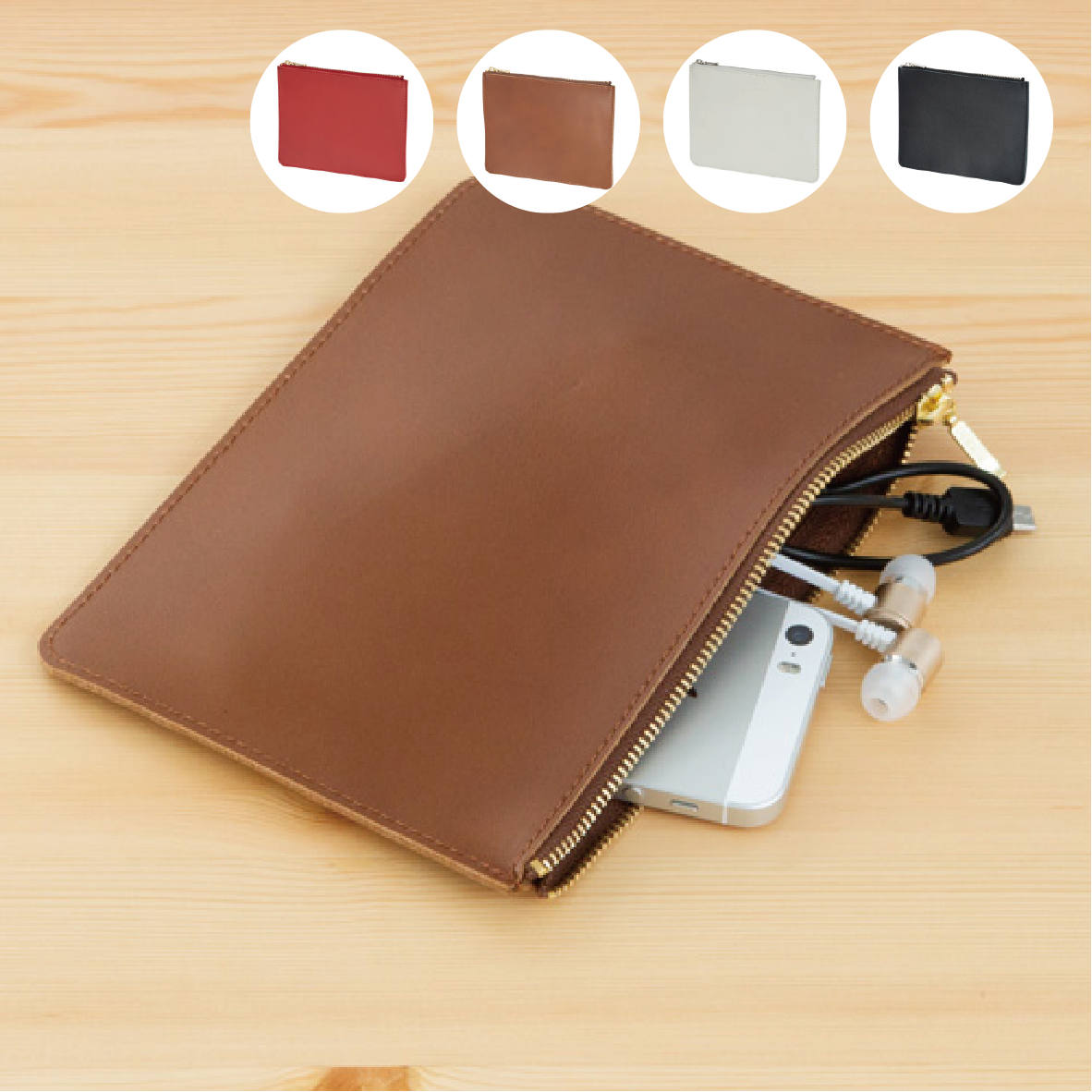 マチのないフラットタイプの本革ファスナーポーチ