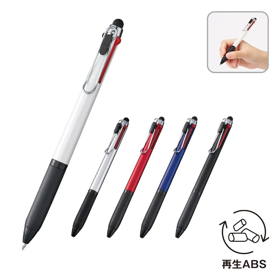 再生素材を使用した、赤・青・黒の3色インク多機能ペン。 -