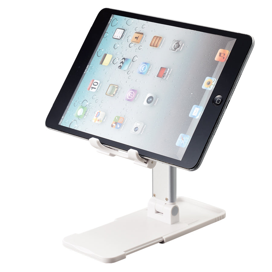 スマホだけでなくタブレットを置くこともできるマルチスタンド。 -