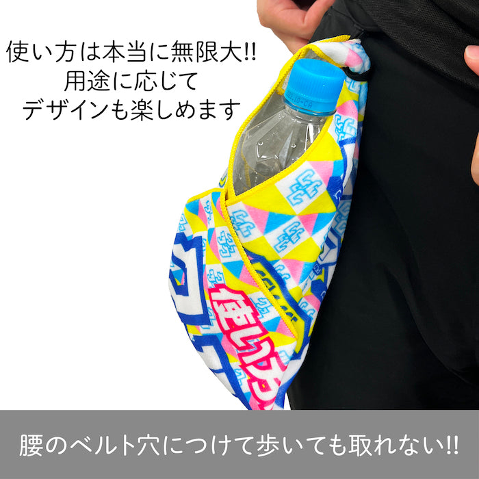袋状に折りたたんだタオルにペットボトルをいれても全く外れない不思議な新感覚グッズです。
