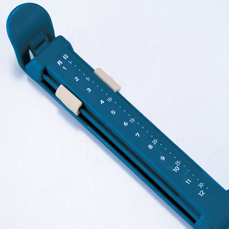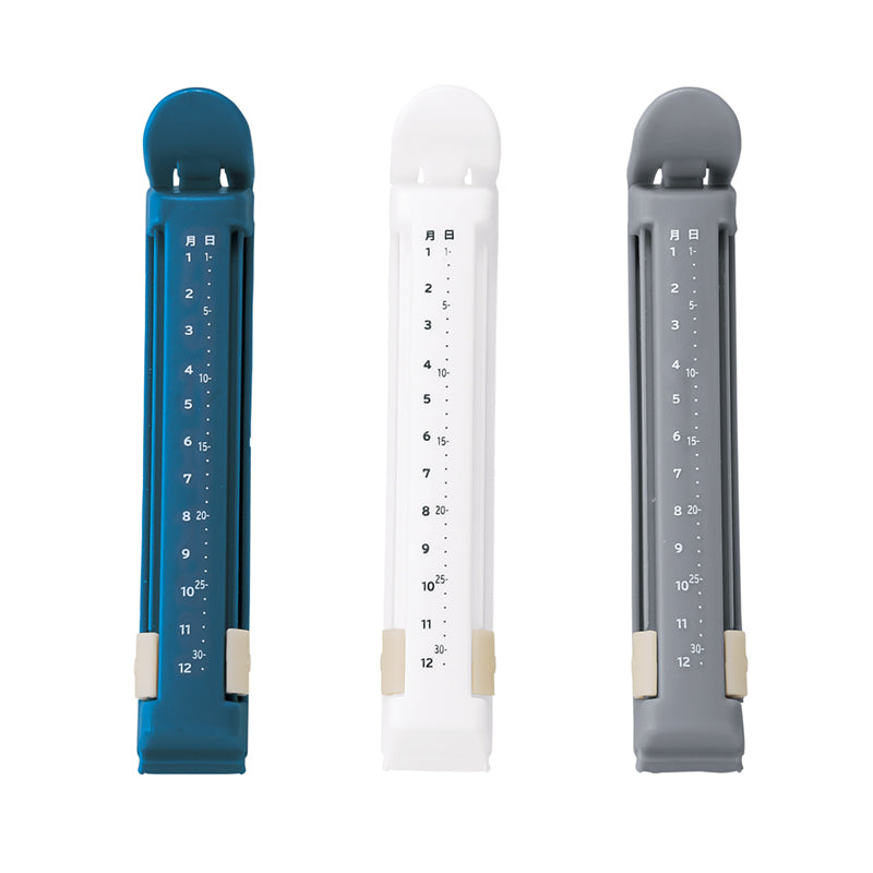 食品の保存に役立つフードクリップ。月日が記録できるスライド式メモリが便利。