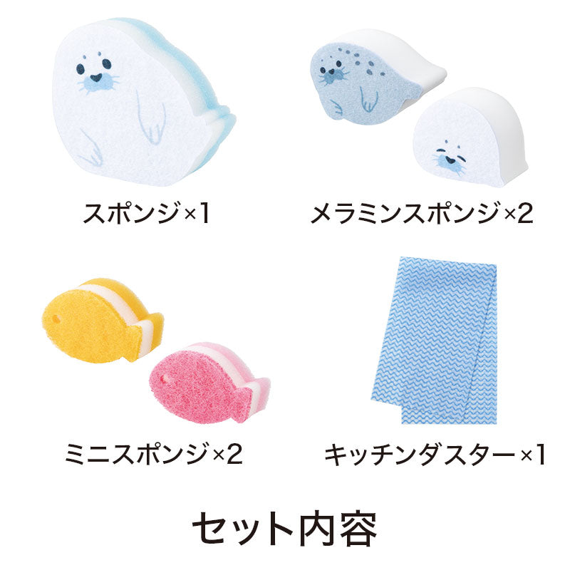 スポンジ/約85×100×30mm、ミニスポンジ/約45×65×30mm、メラミンスポンジ/約45×65×30mm、キッチンダスター/約500×300mm