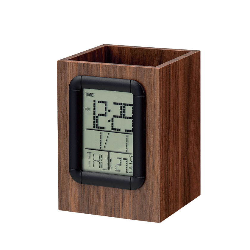 正面に大きく表示される時計は、「時計・温度・カレンダー・アラーム・タイマー・ペンスタンド」と機能満載のSDGsなおしゃれアイテムです。