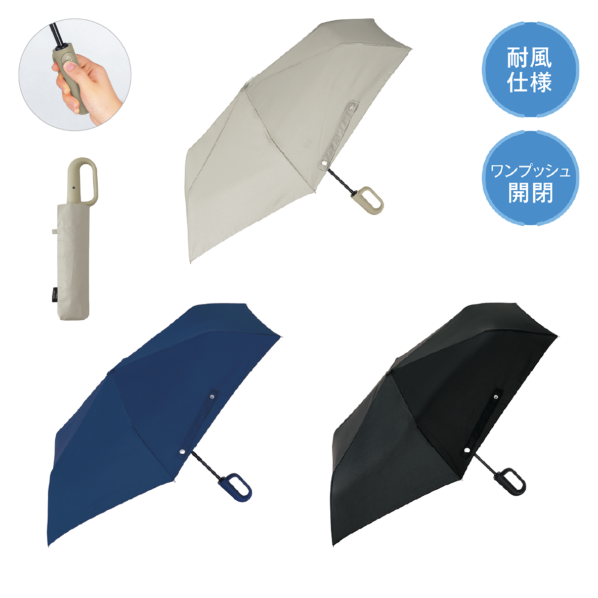 カラビナハンドル自動開閉耐風折りたたみ傘
