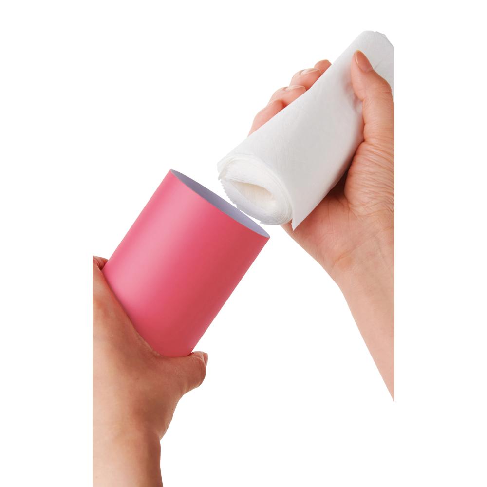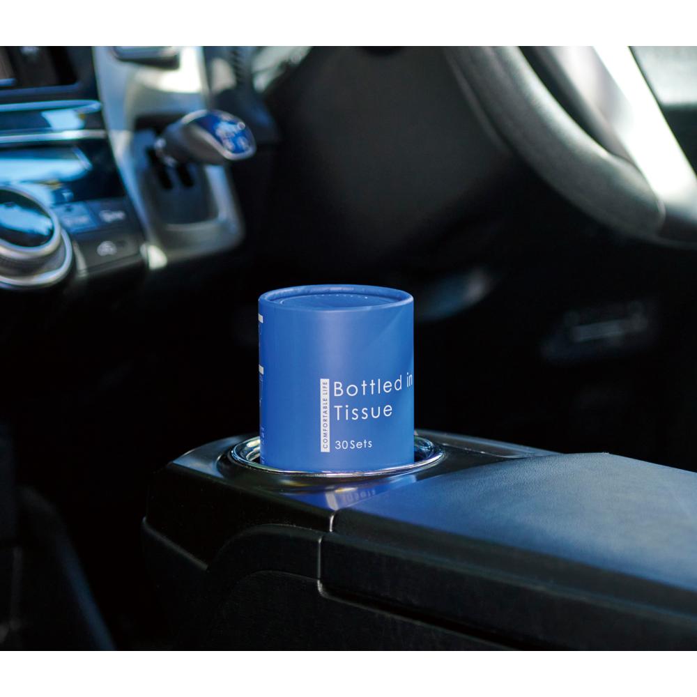 置き場所を選ばない30枚入りティッシュケース。車のドリンクホルダーにすっぽり入る円柱型で、デスクや車内で邪魔にならないコンパクトなサイズ。市販のティッシュを半分に切って詰め替えが可能なので繰り返し使うこともできます。販促品用にロゴやマークの名入れをすれば企業やお店のイメージアップにもつながります。