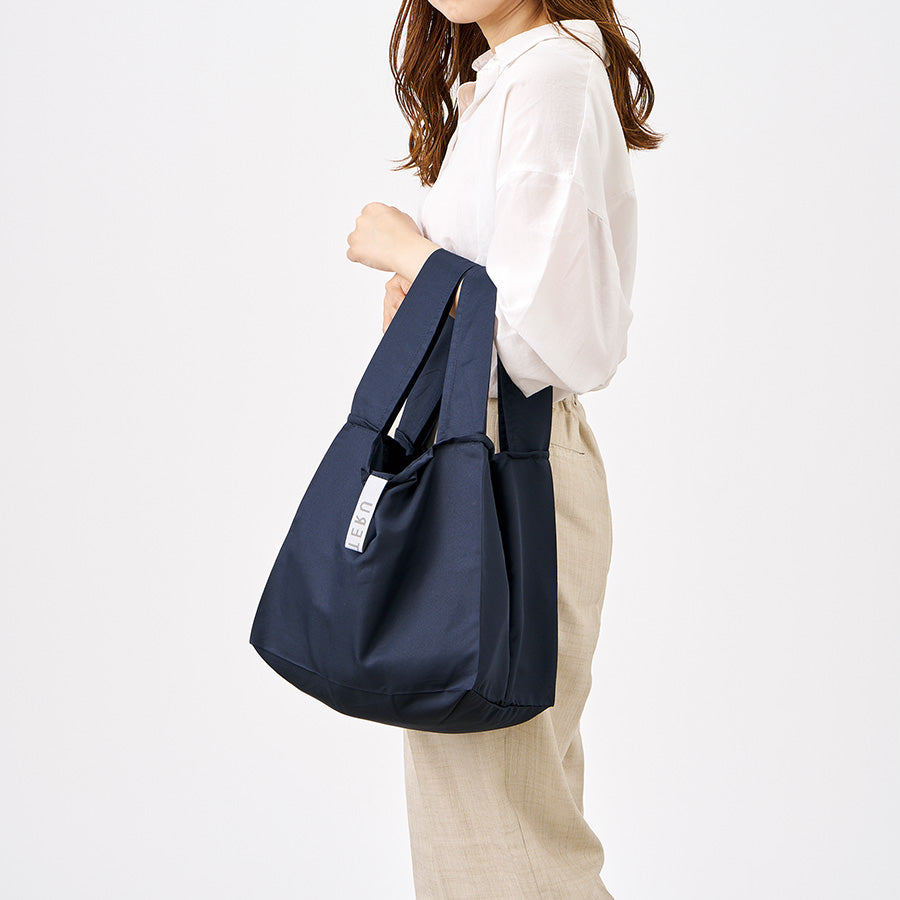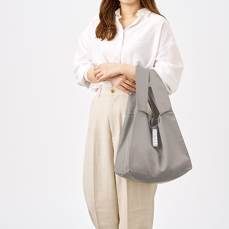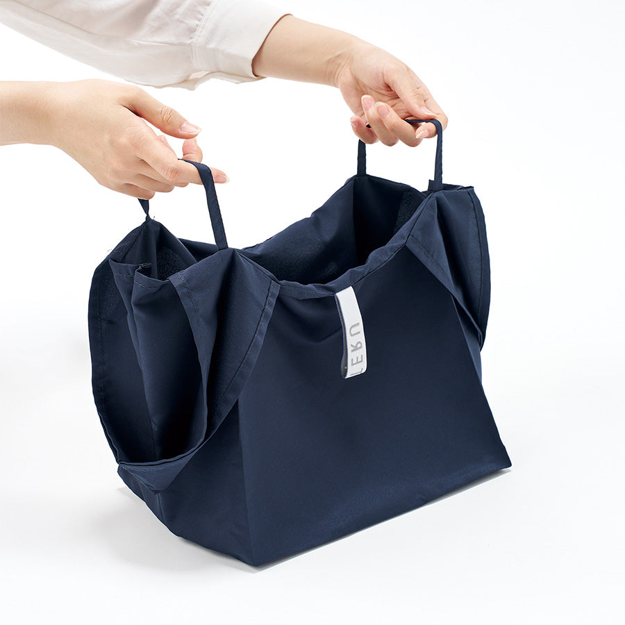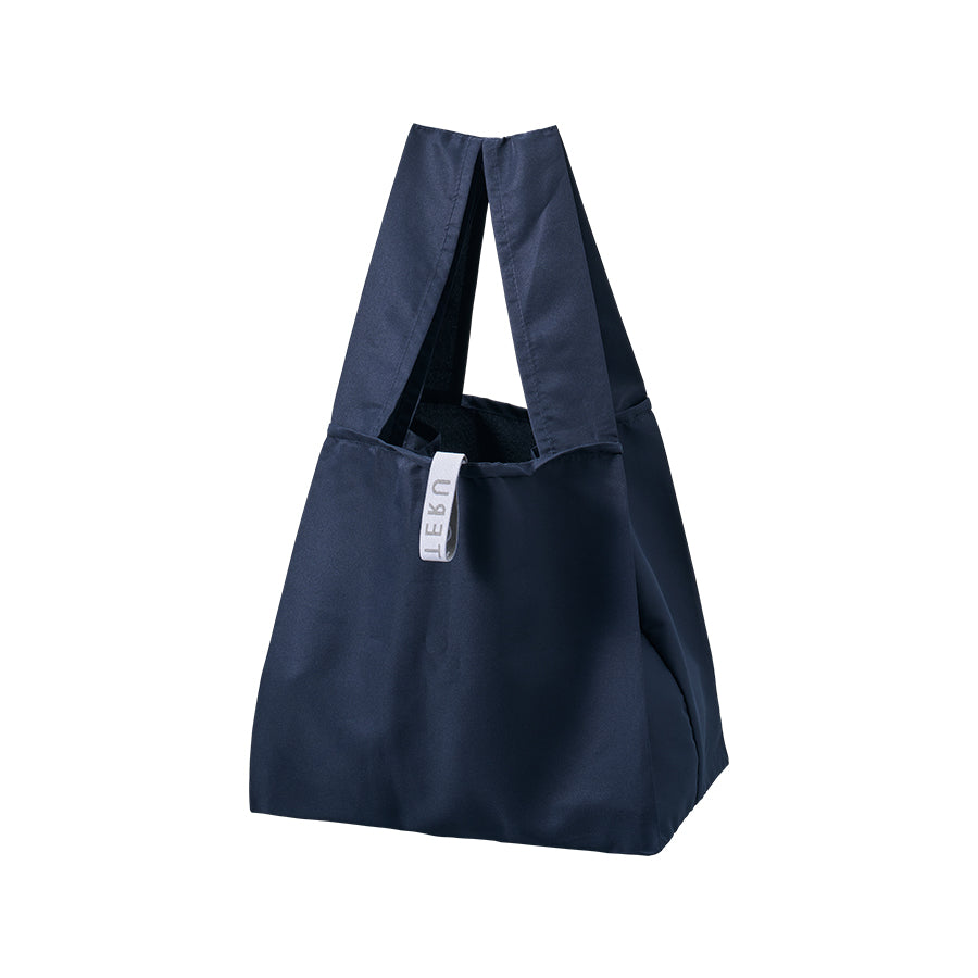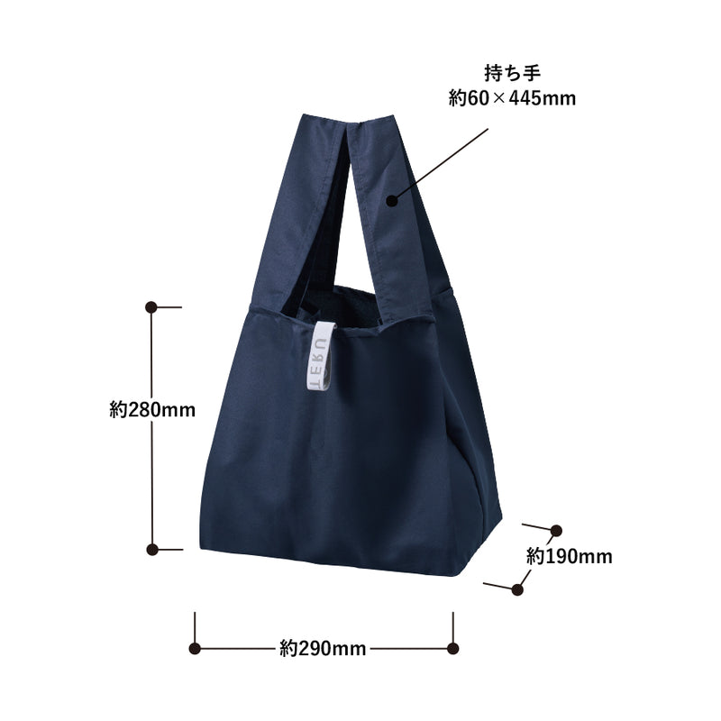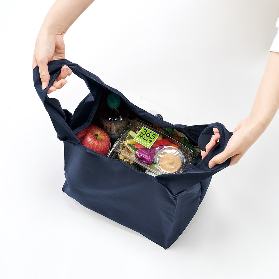 セルフレジで袋詰めがしやすいスクエア型エコバッグ。広いマチで安定し、食品を詰めやすい設計です。 持ち手はレジバーに引っ掛け可能で、低いバーには内側の紐で対応。さらにゴムバンドで折りたたみでき、 かさばらず持ち歩けます。