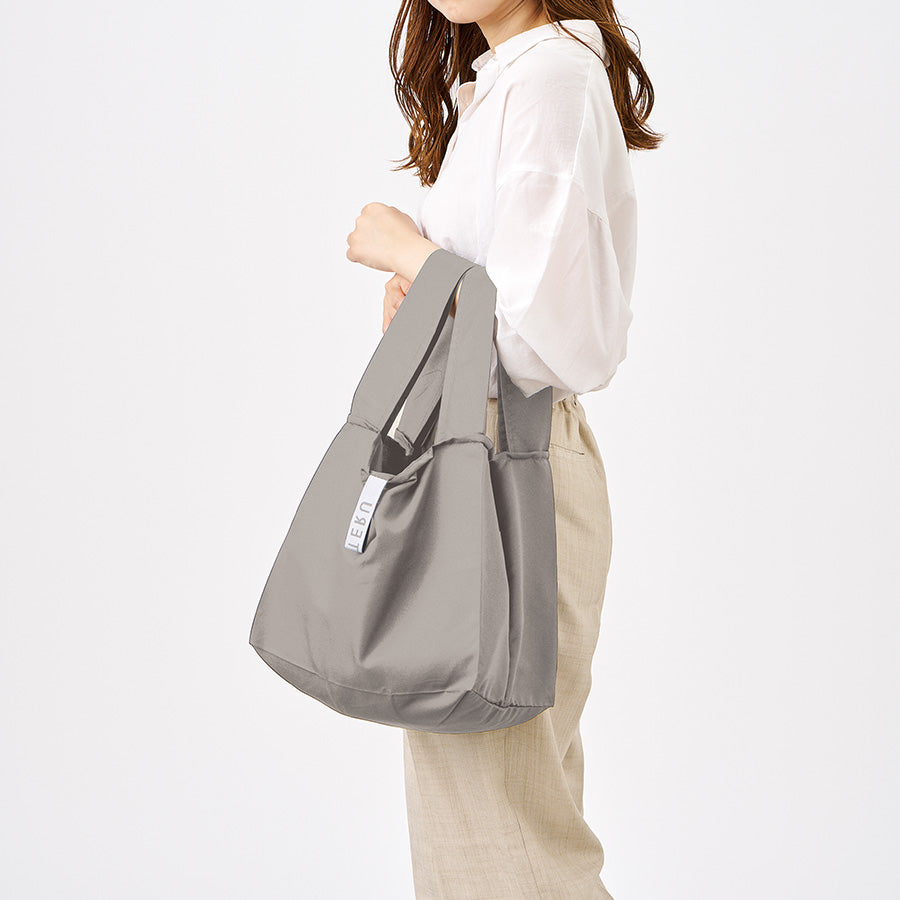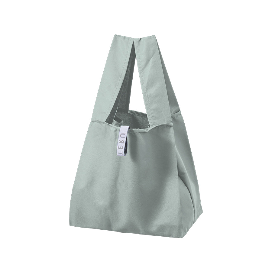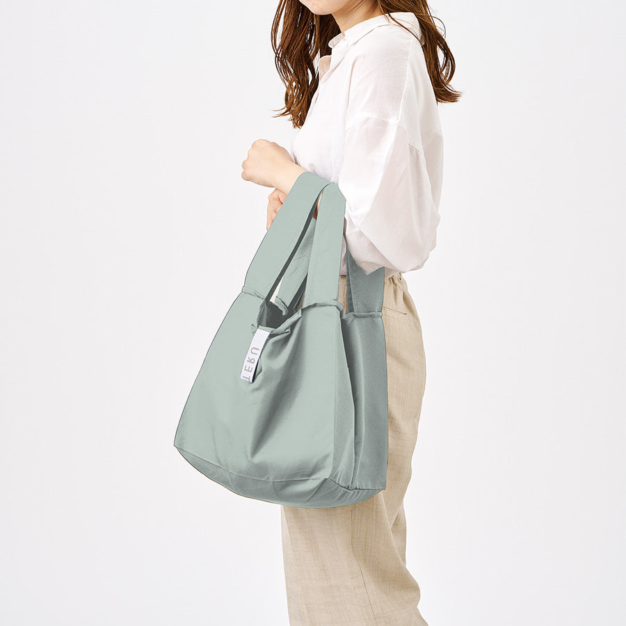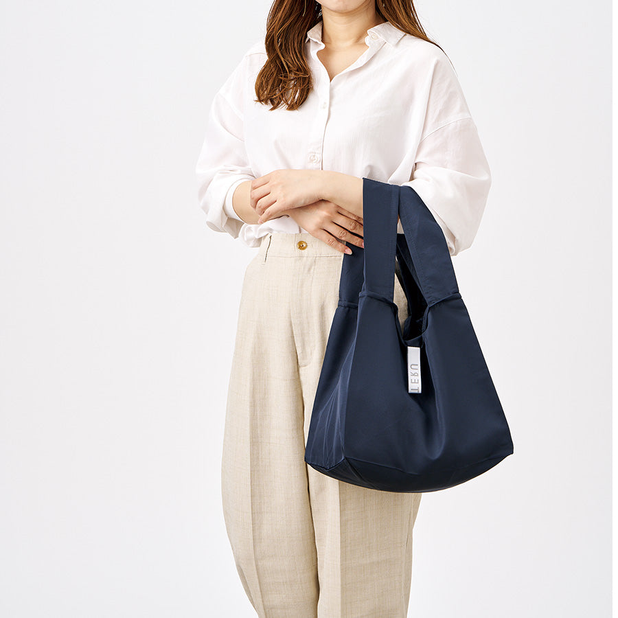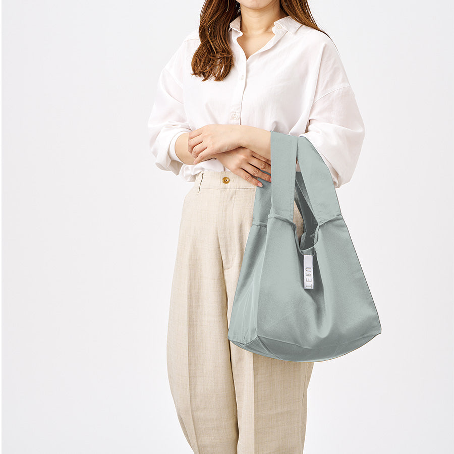 セルフレジで袋詰めがしやすいスクエア型エコバッグ。広いマチで安定し、食品を詰めやすい設計です。 持ち手はレジバーに引っ掛け可能で、低いバーには内側の紐で対応。さらにゴムバンドで折りたたみでき、 かさばらず持ち歩けます。