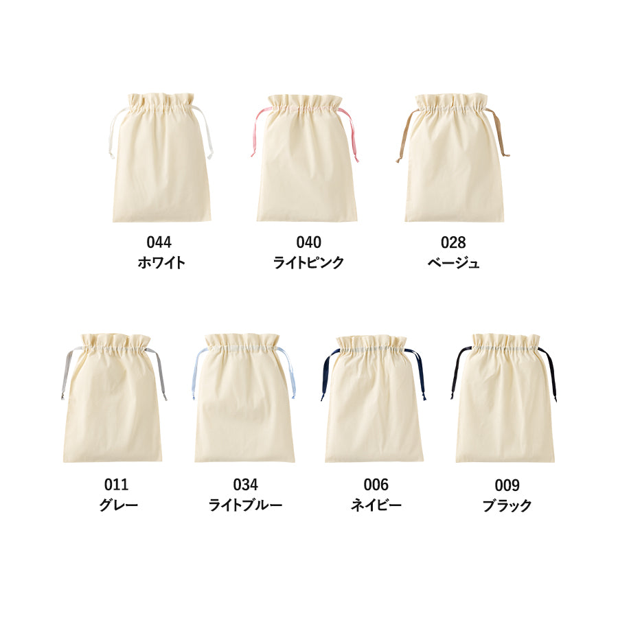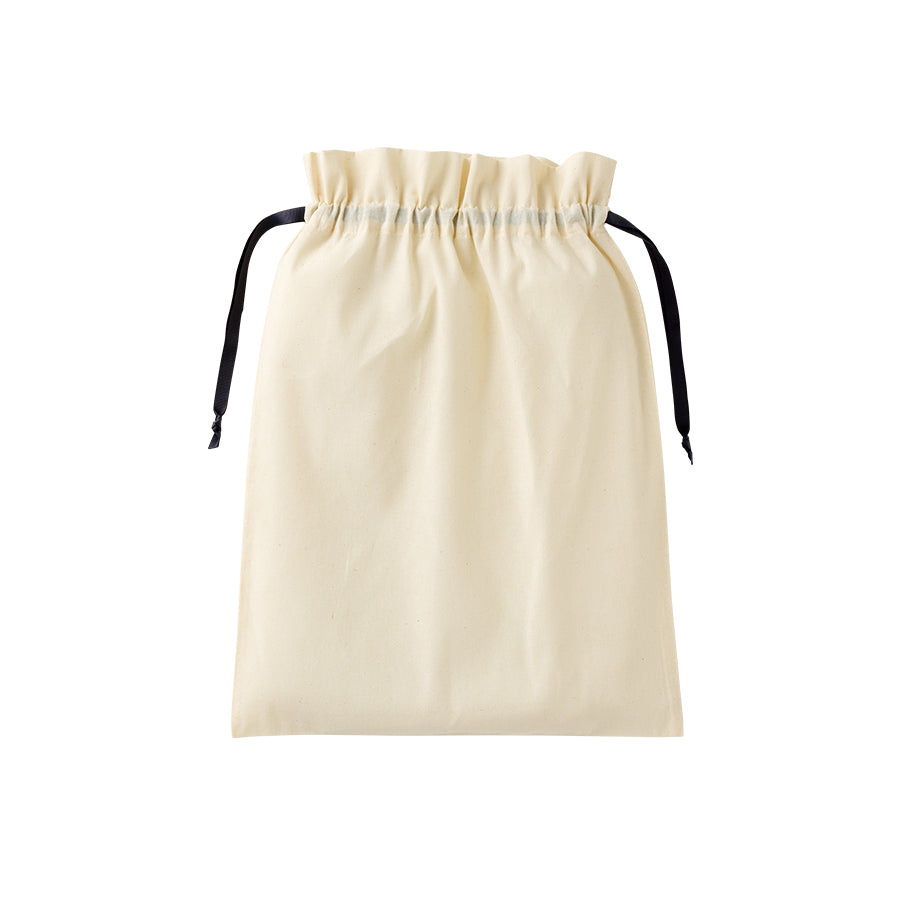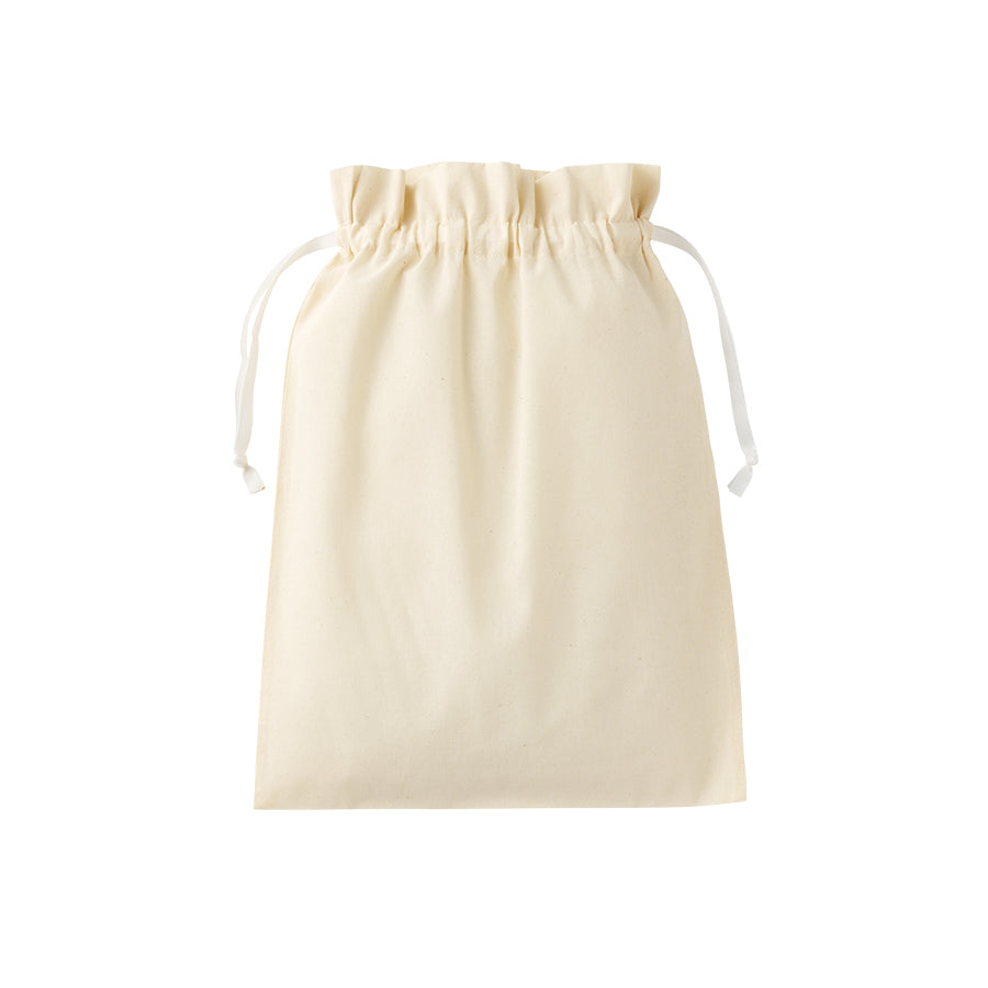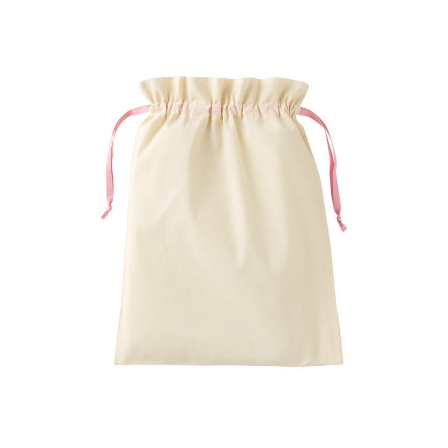 7色展開のカラーリボンがポイントのコットン巾着。ナチュラルカラーのボディはどんなデザインにもマッチし、リボンは長め仕様で華やかな結び目を演出。SS~Lの4サイズ展開で、Mサイズはトラベルポーチや箱入りコスメにも最適。単色からフルカラー印刷まで対応可能で、化粧品ブランドや食品パッケージ、アパレルノベルティにもおすすめです。