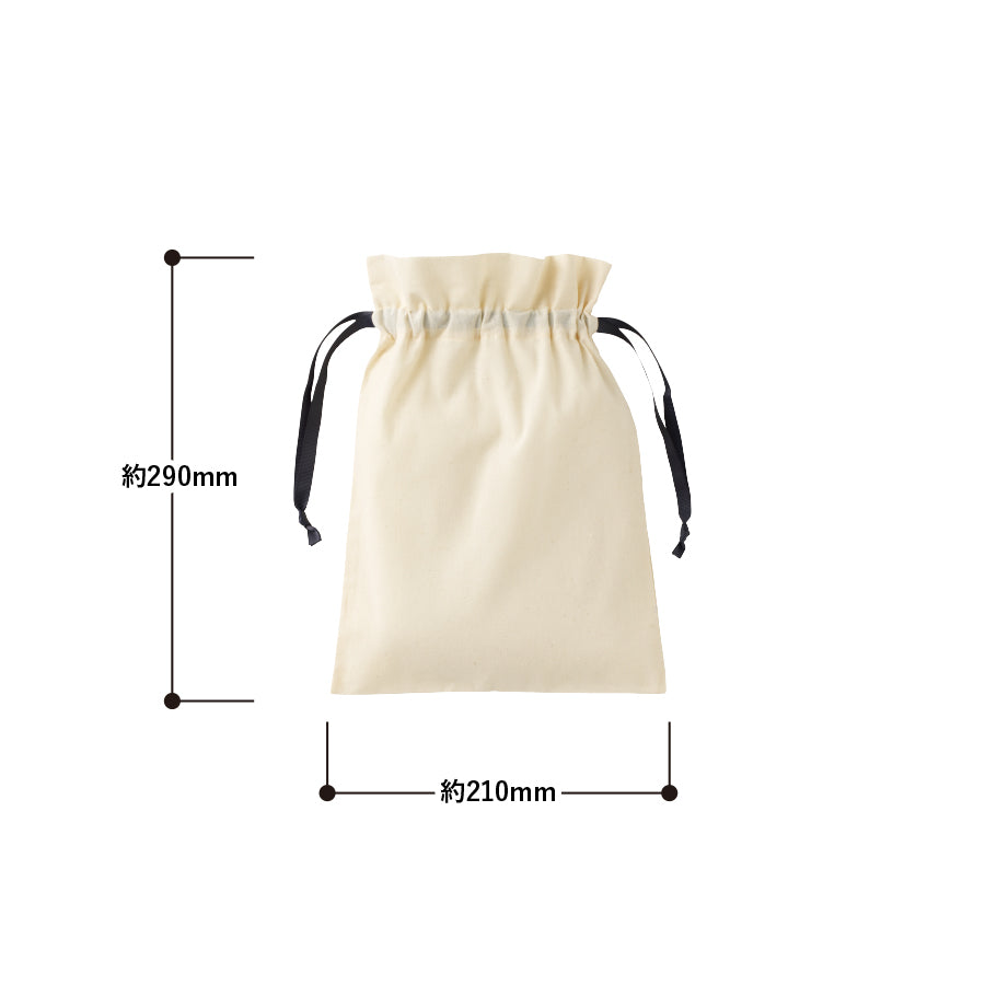 7色展開のカラーリボンがポイントのコットン巾着。ナチュラルカラーのボディはどんなデザインにもマッチし、リボンは長め仕様で華やかな結び目を演出。SS~Lの4サイズ展開で、Mサイズはトラベルポーチや箱入りコスメにも最適。単色からフルカラー印刷まで対応可能で、化粧品ブランドや食品パッケージ、アパレルノベルティにもおすすめです。