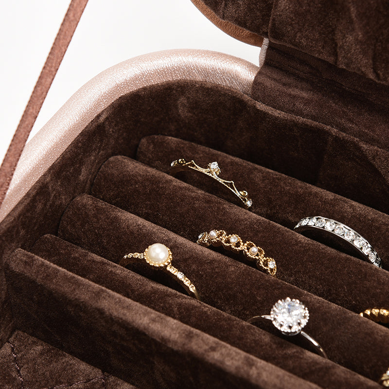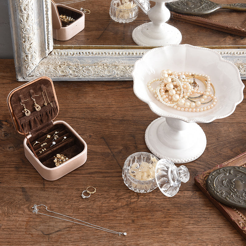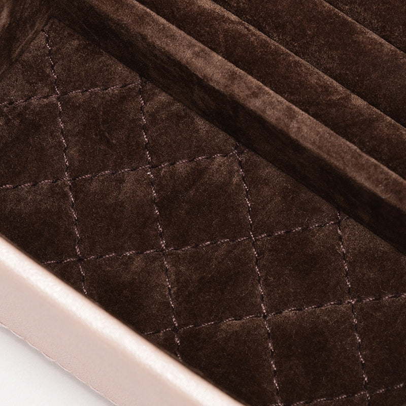 そしてベルベットの内生地は、アクセサリーを優しく守りつつ美しさをより際立てる効果も。さらに底面にはアクセントとしてキルティング仕様になっているなど、シンプルながら細部までこだわった、宝物のための“とっておきの場所”。