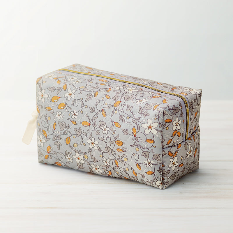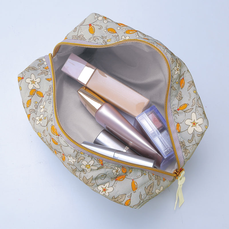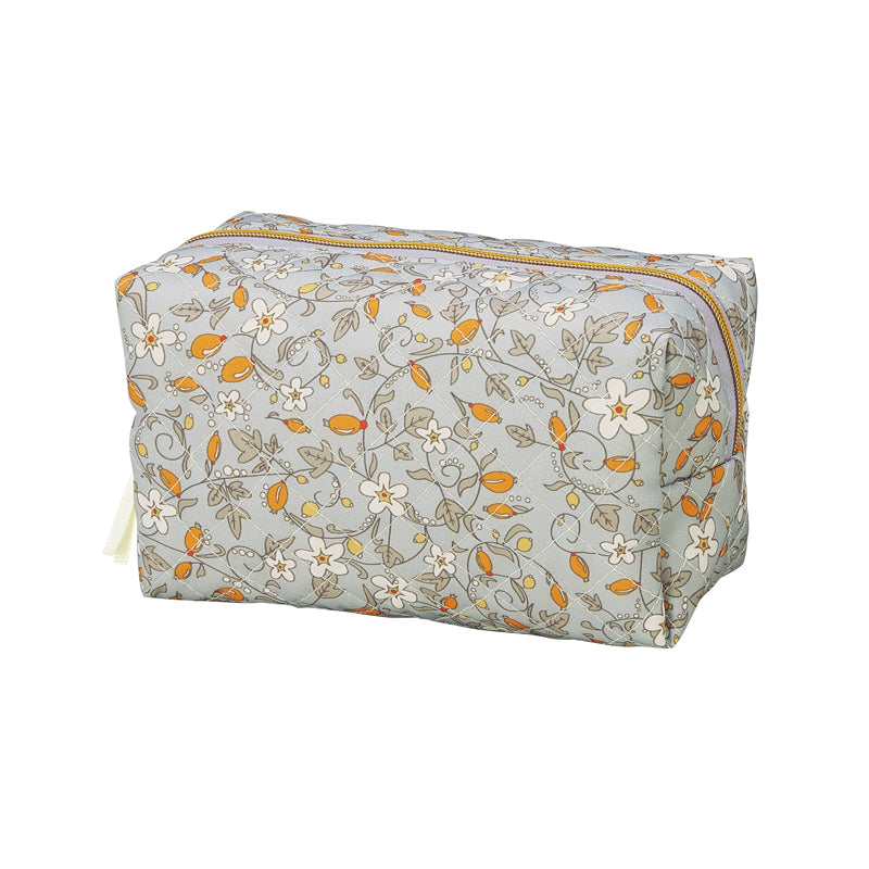 女性らしい華やかさと容量の多さ、存在感あるキルティング生地が魅力のボックス型ポーチ。