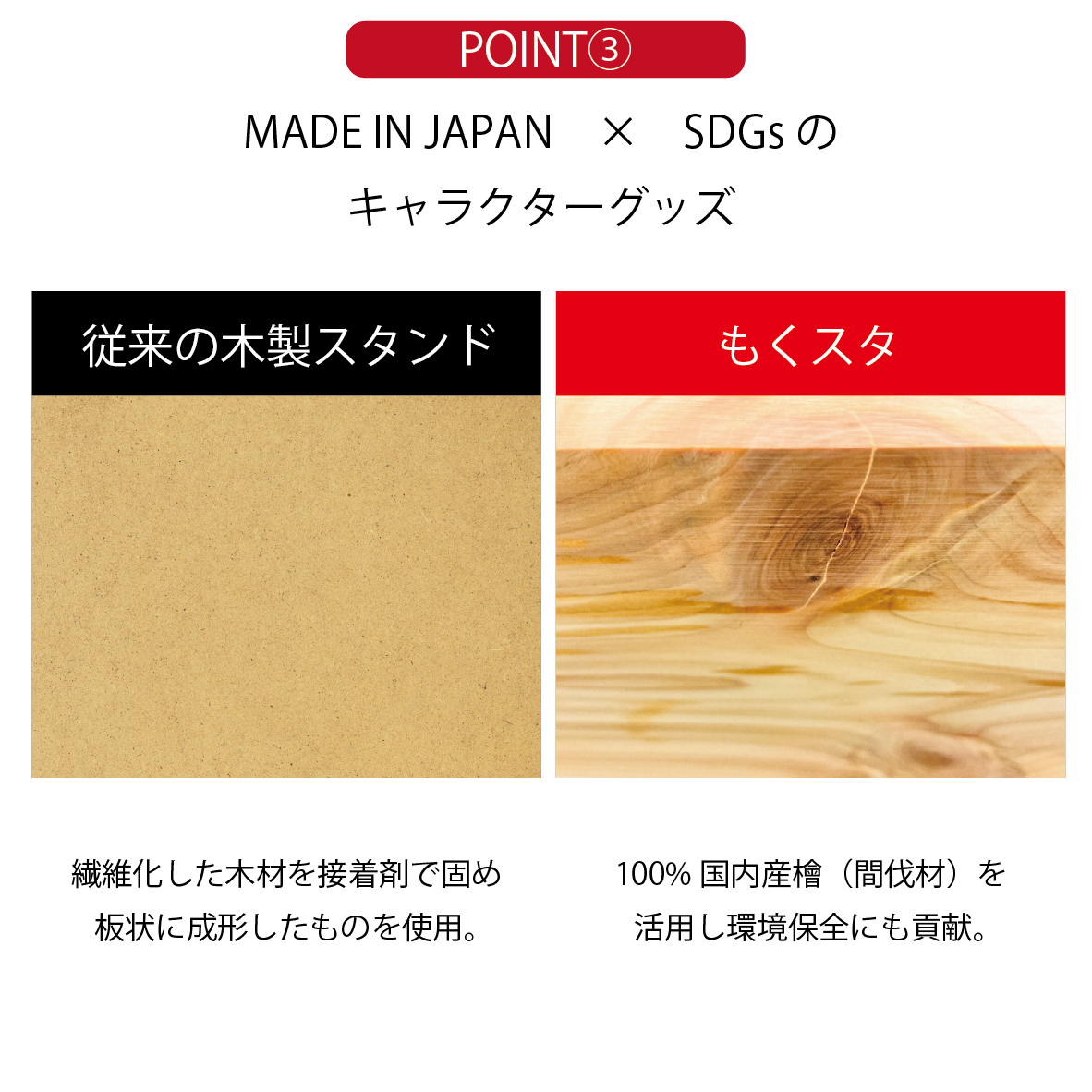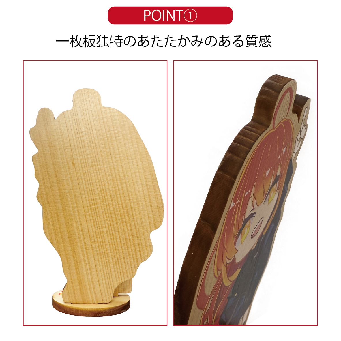 市場で出回っている定番のアクリルスタンド(アクスタ)や、木製スタンド(MDF素材)にモクスタ(檜の間伐材)が登場。日本国内の天然檜の間伐材でできているので、環境にも配慮したフルカラー印刷のオリジナルグッズを作ることができます。