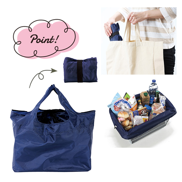 レジカゴにぴったり収まる巾着仕様の大容量エコバッグ。