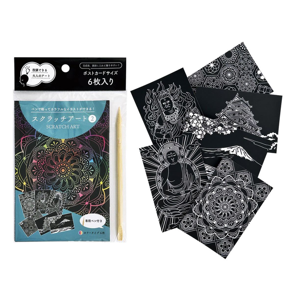 付属の専用ペンで印刷された白い線を削っていくだけで素敵なカラフルなイラストができる商品です。カラータイプ6種のデザインが各1枚と専用ペン1本がセットになっています。