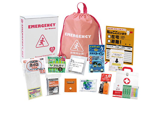 非常持出袋・防災の心得・ホイッスル・緊急避難カード・カイロ・レインコート・携帯用トイレ・救急4点セット・生理用ナプキン(8枚入)・静音アルミブランケット・使い捨てフェイスタオル・マスク・水に流せるペーパー