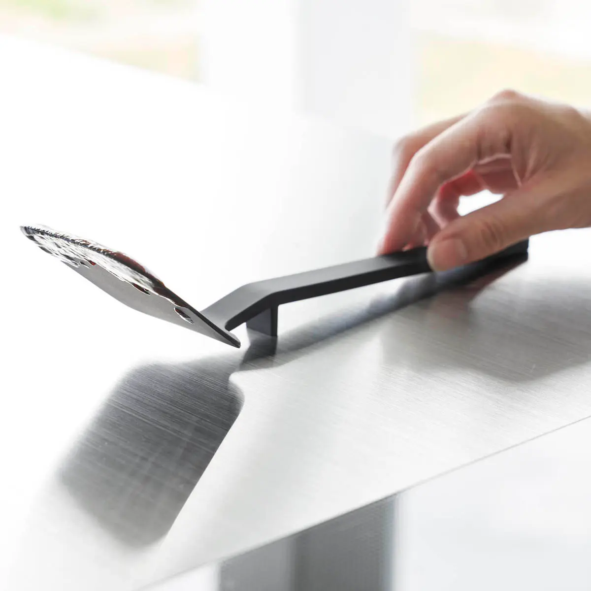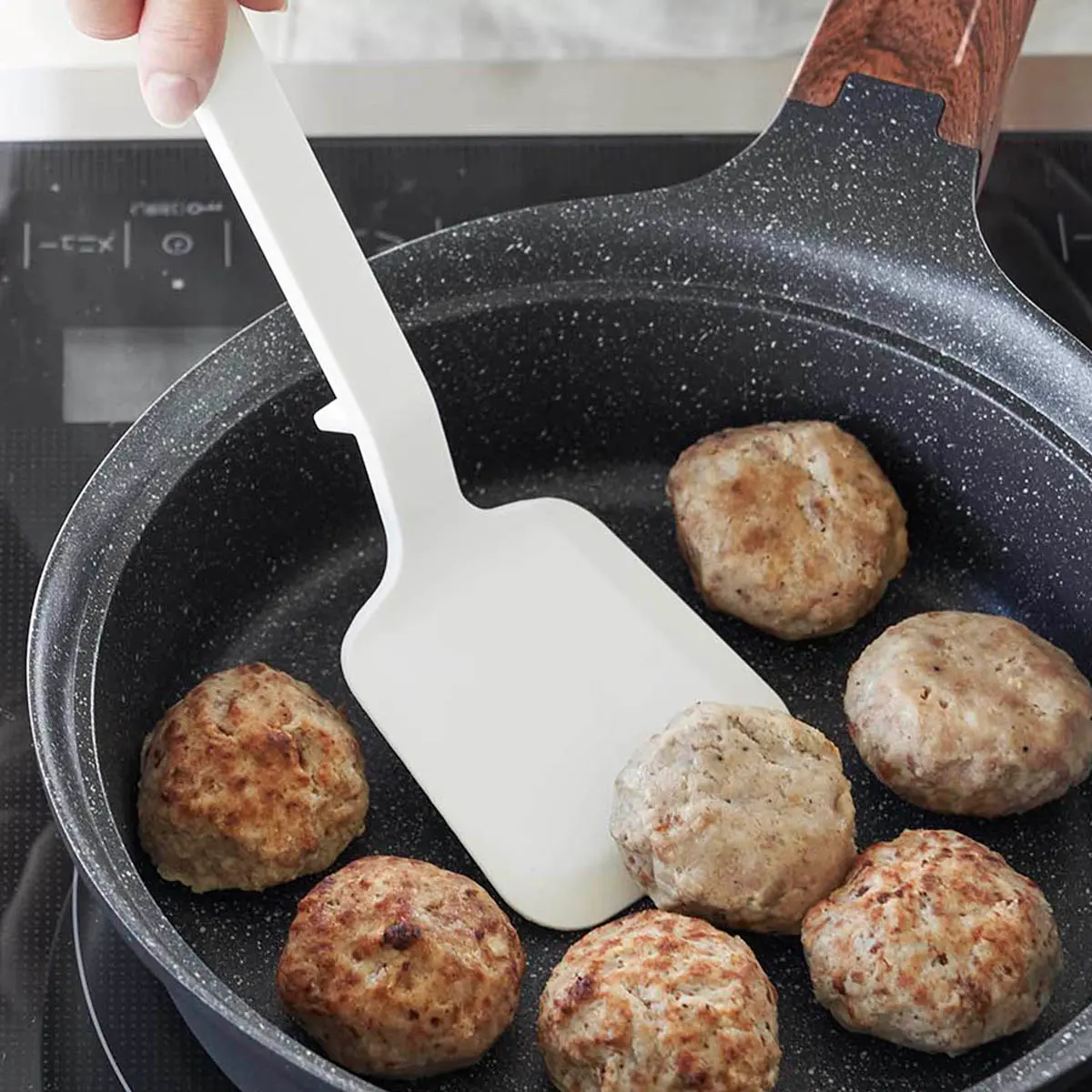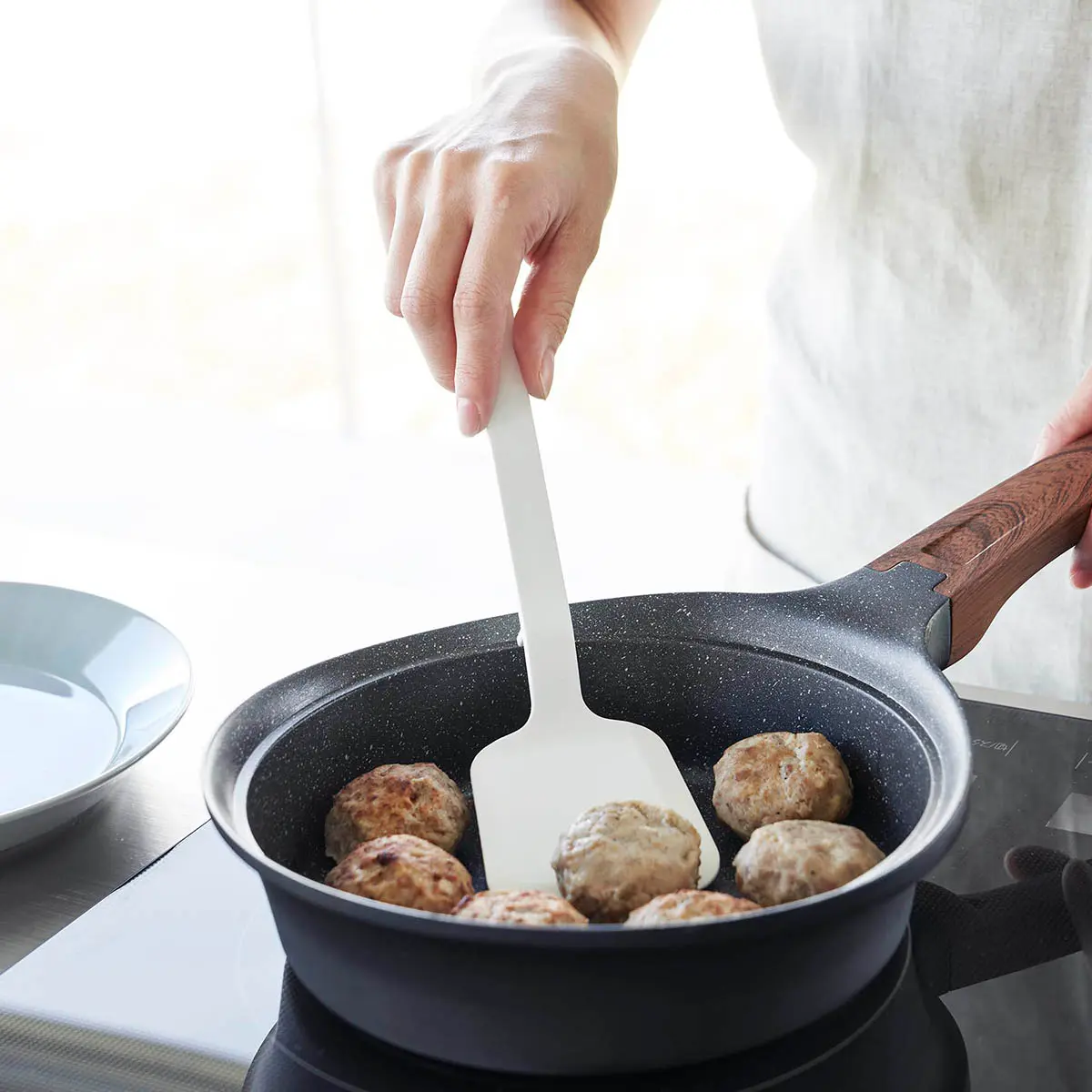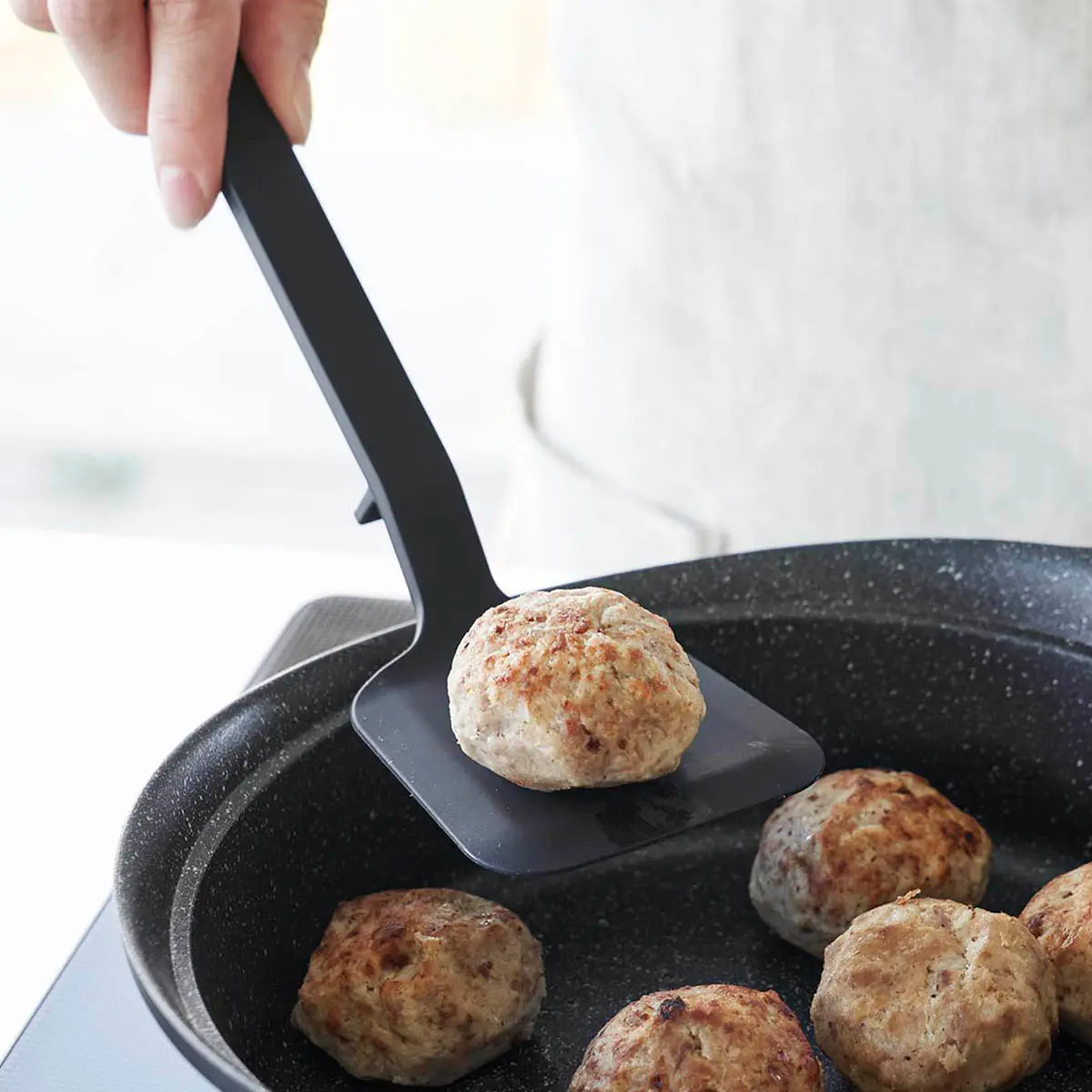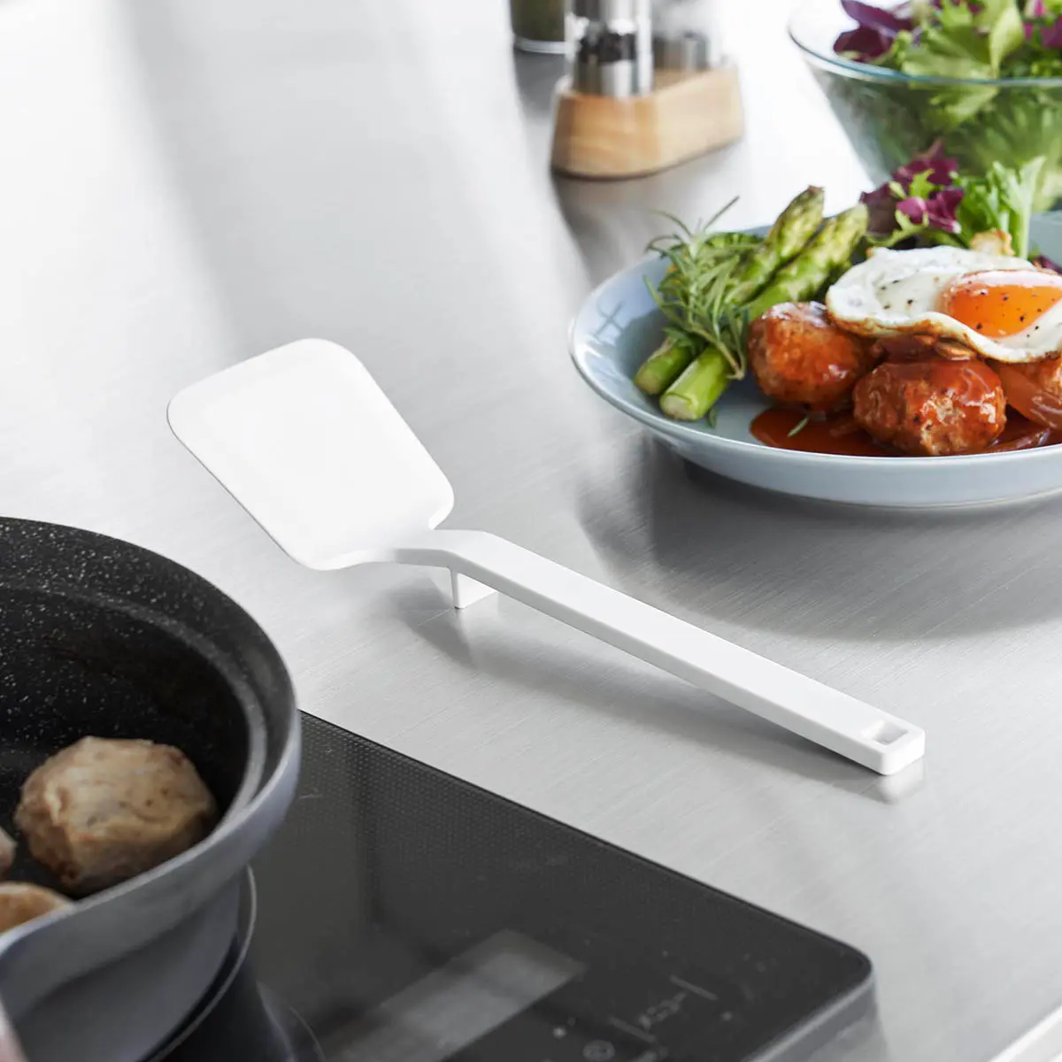 シリコーンコーティングされているのでフライパンや鍋などをキズつけません。ヘラがしなり、滑りにくいので食材をきれいに返せます。置いたときに先端が浮くので直置きにならずに清潔、調理中の置き場に困りません。