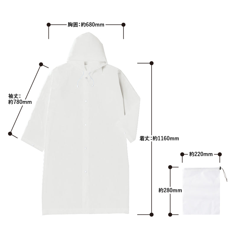 レインコート/胸囲:約680(mm) 着丈:約116(mm) 袖丈:約780(mm) EVA巾着/約W220×H280(mm)