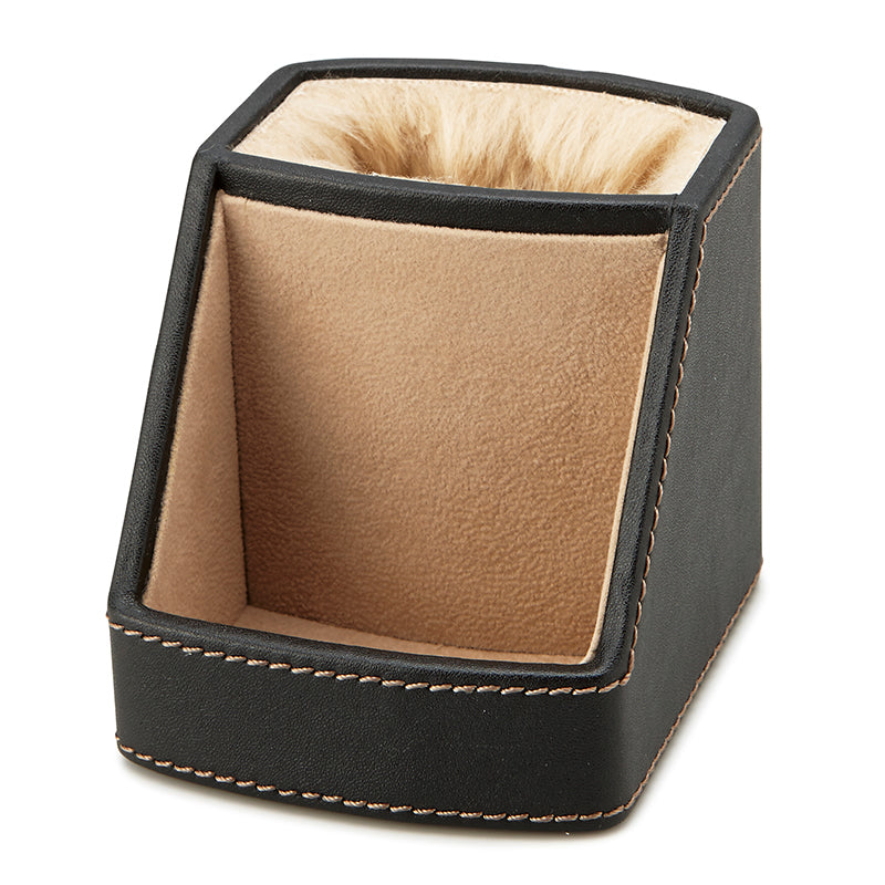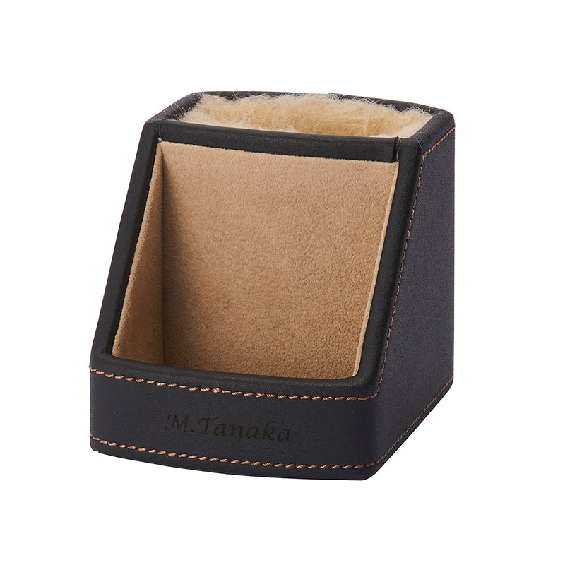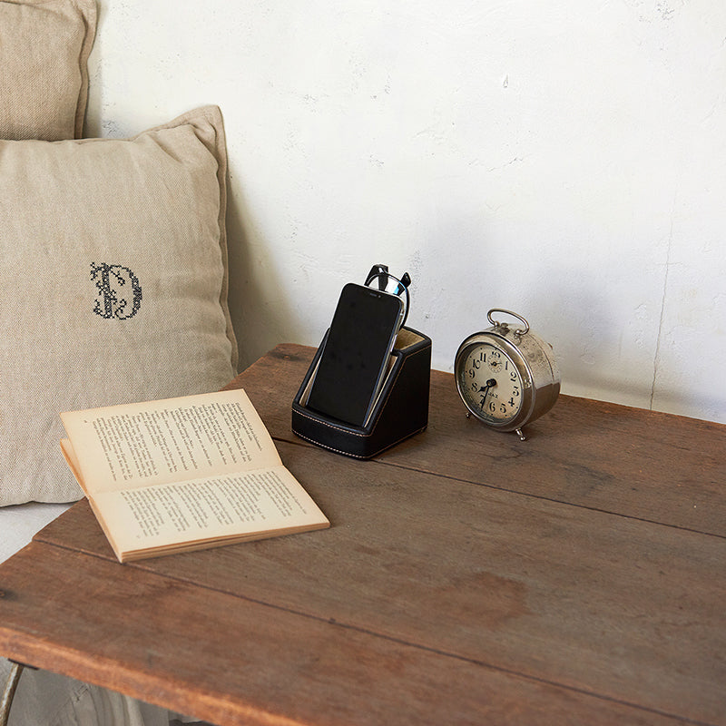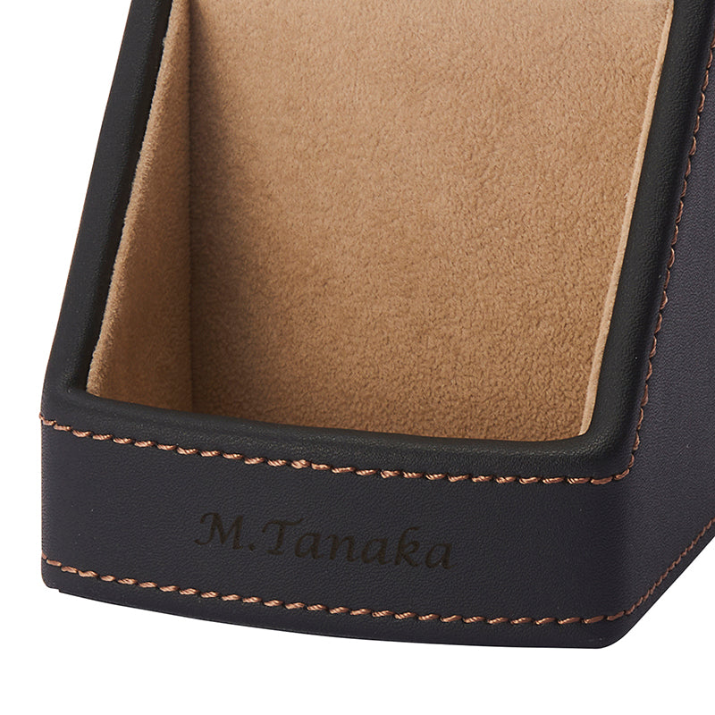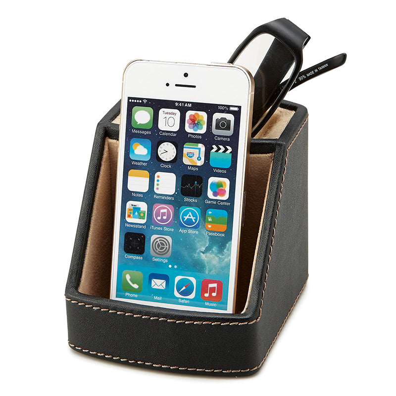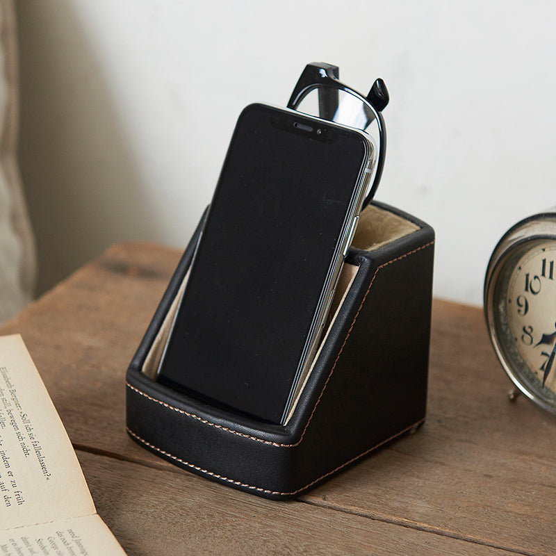 ブラックの生地にブラウンのステッチが上品な携帯&メガネスタンド。