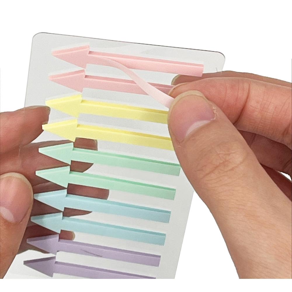 細かい箇所や重要箇所を指し示すのに便利な矢印型ふせんパステルカラー。学生向けノベルティに。