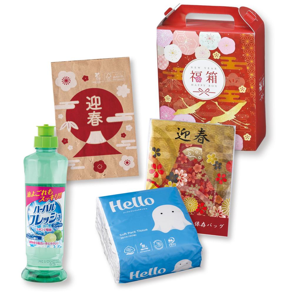 二羽の鶴が舞う優雅な化粧箱に納めた日用品の福箱です。