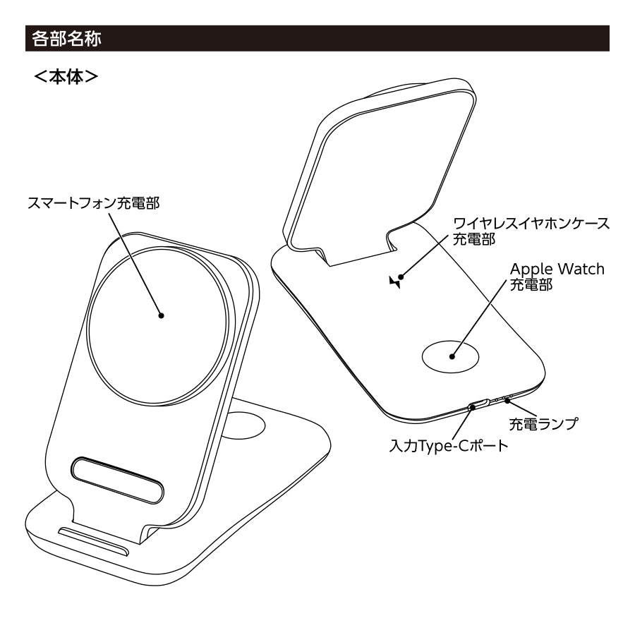 ※充電可能箇所はスマートフォン充電部、ワイヤレスイヤホン充電部、Apple Watch充電部の3ヶ所です。