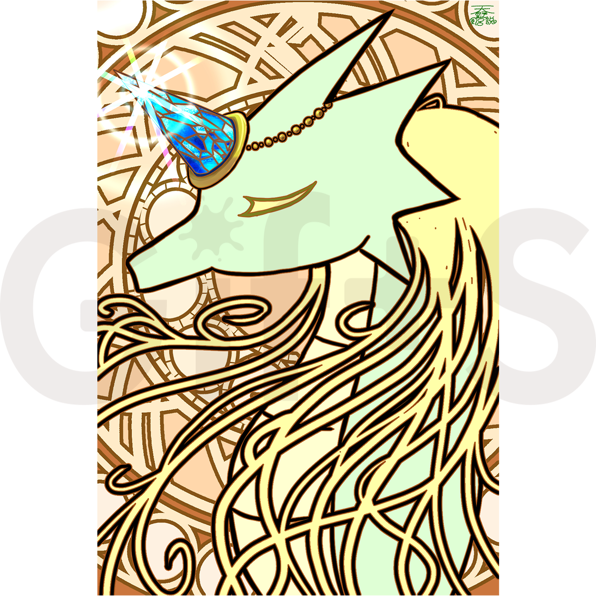 遺跡にあるような壁画やステンドグラス風、アルフォンス・ミュシャっぽい雰囲気にしたかったため、影はあえてつけていません。