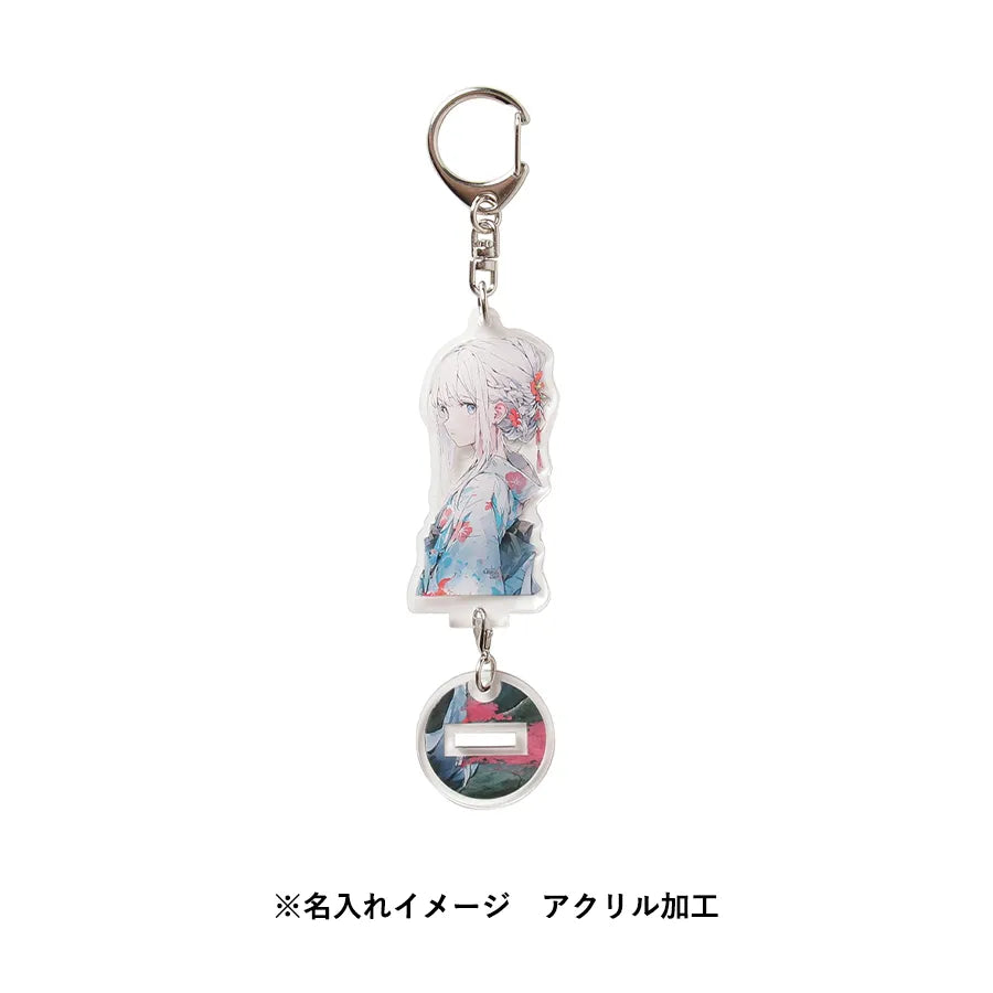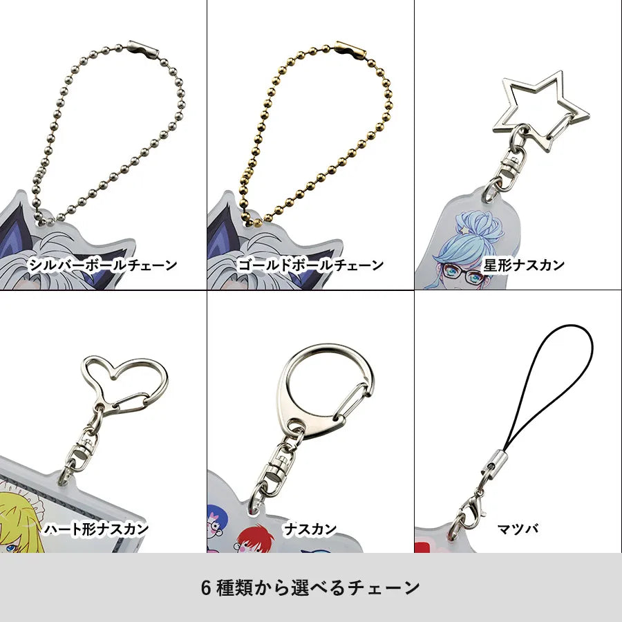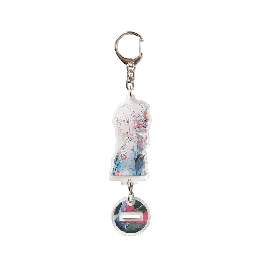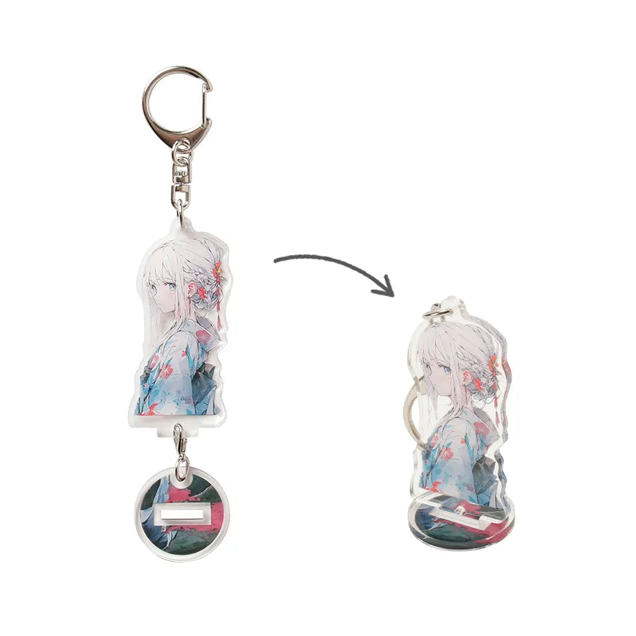 スタンドと台座を連結させて持ち運べるアクリルキーホルダーです。