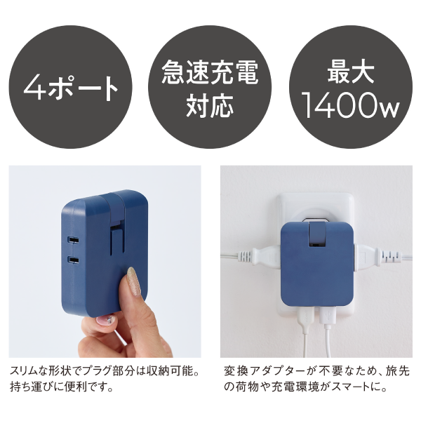 急速充電対応、4ポート、最大1400W使用可能の1つでマルチに活躍するアダプターです。