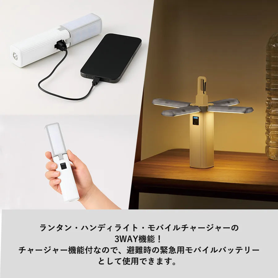 ハンディライト・ランタン・緊急用モバイルチャージャーの3つの用途で使用することができます。
