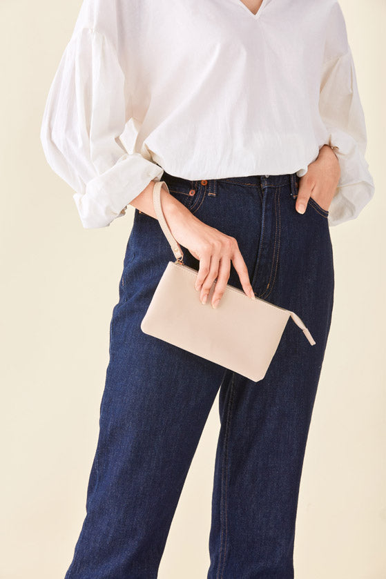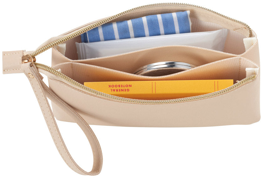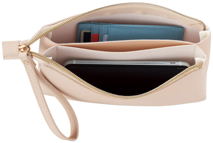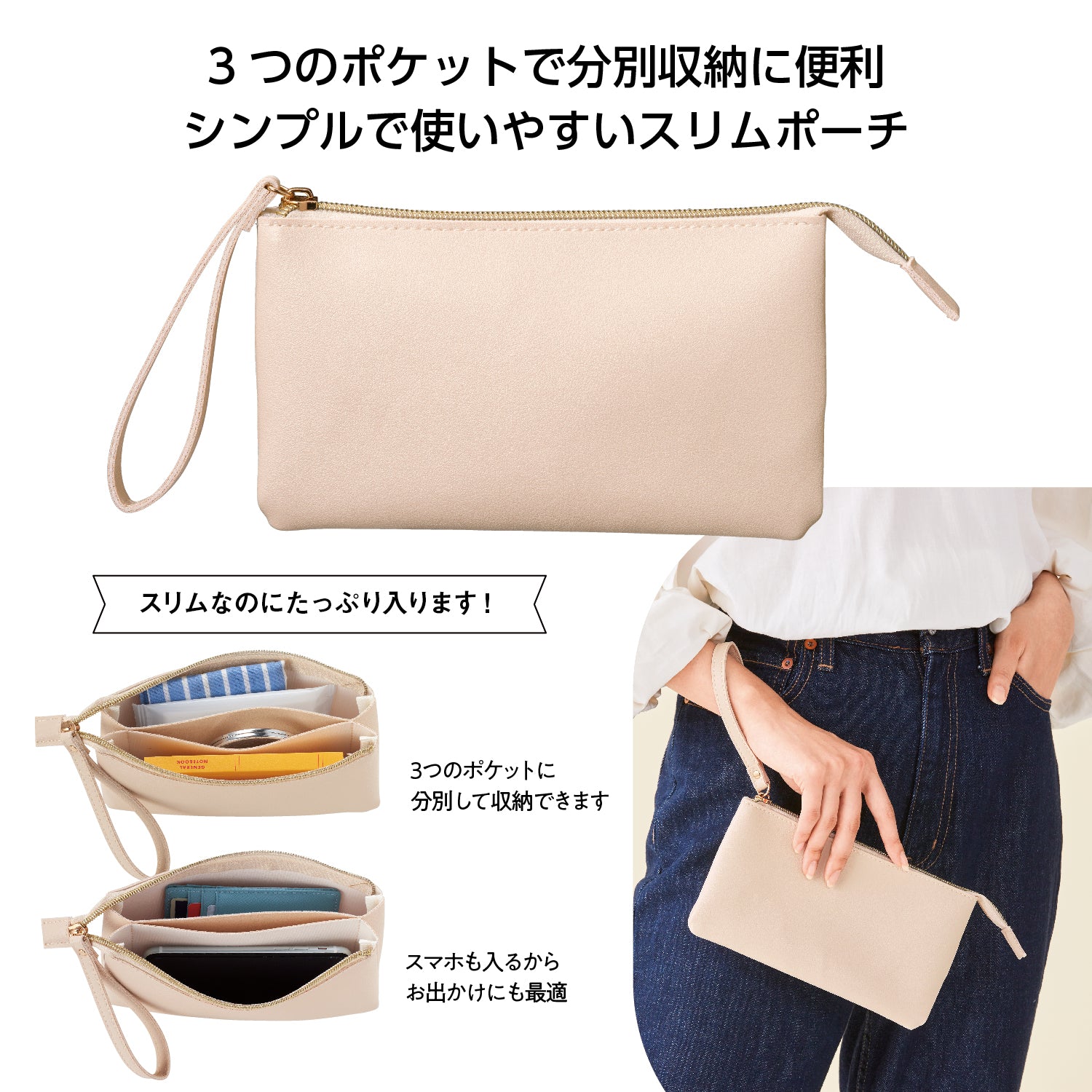 3つのポケットで分別収納に便利な、シーンを選ばないシンプルデザインのスリムポーチです。無地で肌馴染みがいいベージュなので、名入れも映えます。ロゴ等を印刷してノベルティとしてもおすすめです。