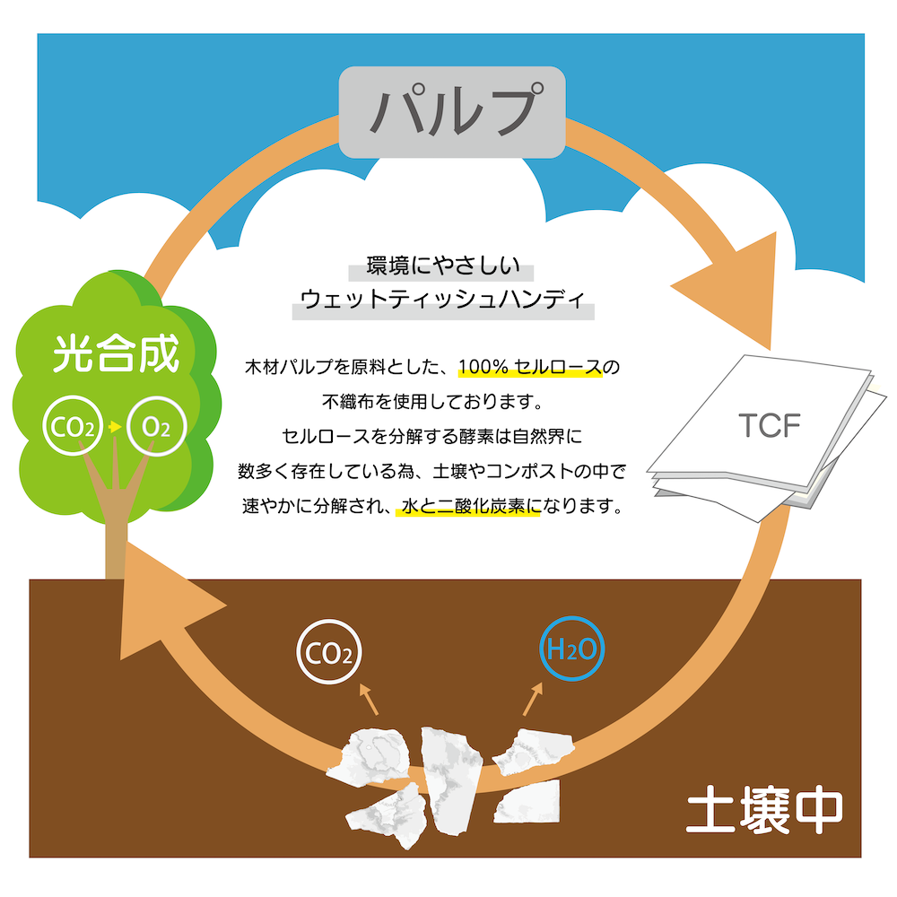 TCFは土壌中やコンポスト中で速やかに水と二酸化炭素に分解されるので、環境にやさしいウェットティッシュです。