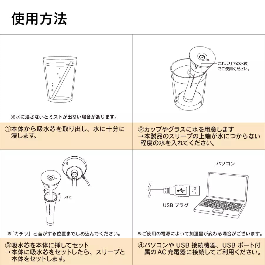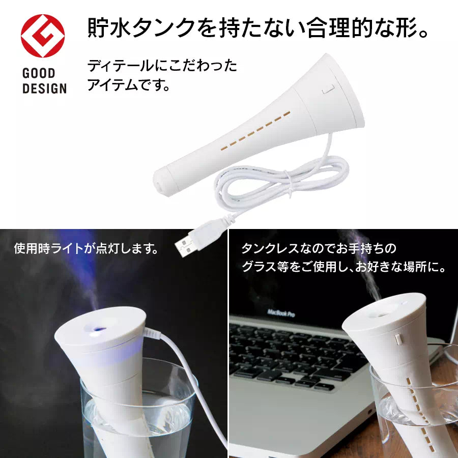 グッドデザイン賞受賞商品のタンクレスなスティックタイプの加湿器です。お好みのグラスやマグに挿して使用出来ます。USB接続でご利用可能なタイプなので、出張時の乾燥したホテルや、自社デスクでの簡易加湿器としてもご利用いただけます。2時間タイマー性なので空焚き防止も出来ます。ホテルや旅館での備品や旅行関係での記念品やノベルティとしてもおススメです。