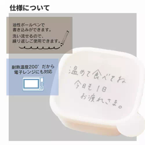 グッドデザイン賞受賞アイテム!フタ部分に油性ペンで書きこむことができ、保存日やメッセージを残せるユニークなアイテム。シンプルながら食卓にコミュニケーションを生むデザインが受賞ポイントとなりました。家の中ではもちろん、お弁当箱として職場やアウトドアに持ち出すこともできます。共働きにより常備菜保存需要の増えた、昨今のニーズに則したアイテムといえます。側面にワンポイントで名入れ印刷ができ、生活の中でPRが可能です。