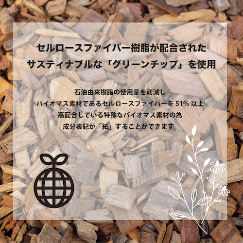 セルロースファイバーを51%以上高配合した新しいバイオマスチップからできている為「可燃物」として廃棄を可能にした新しいSDGs素材です。